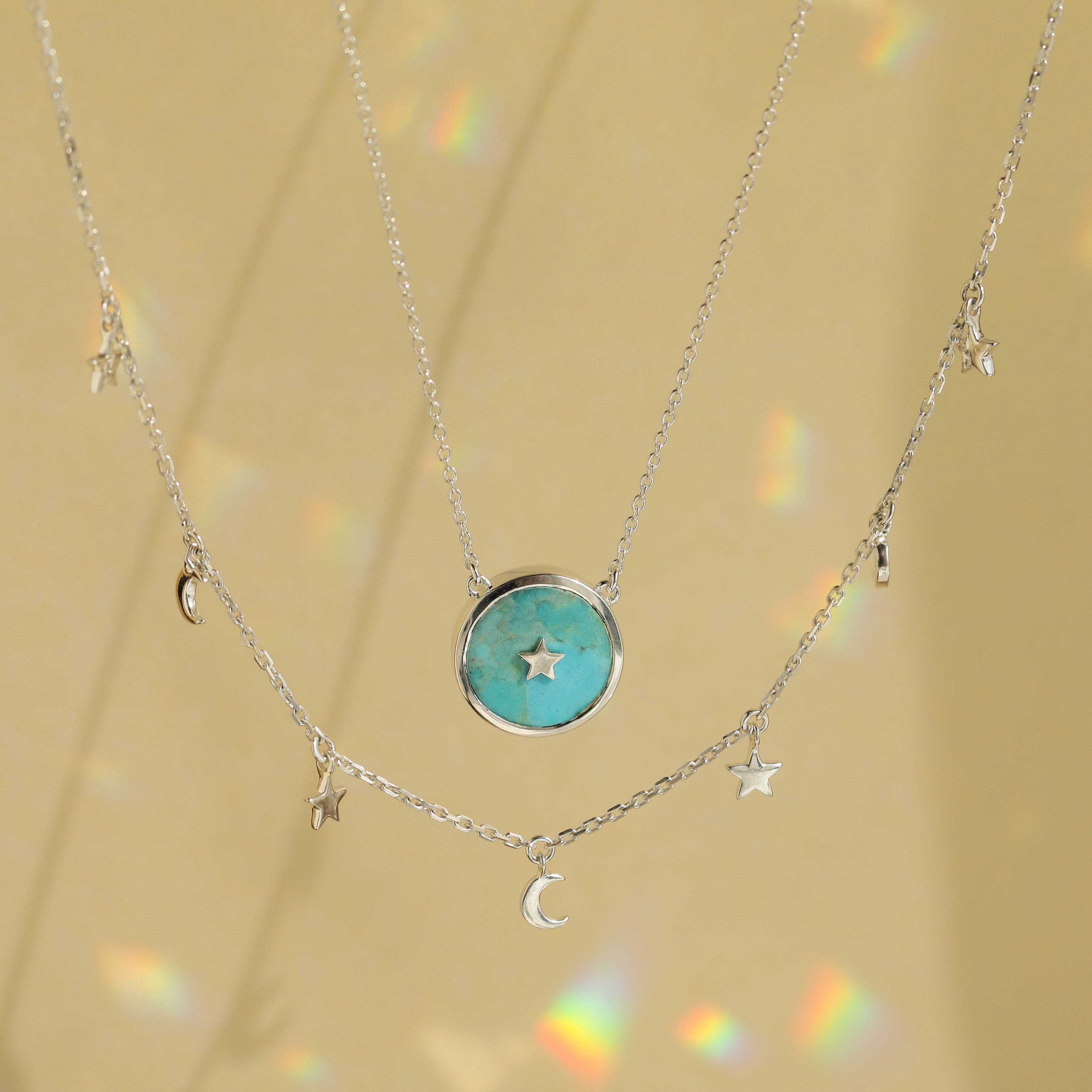 Our Sterling Silver night sky necklace holds a stunning turquoise stone with a tiny 5-point star twinkling brightly in its centre. The hypnotic turquoise mixes blues, greens and metallics to depict flashes of cosmic brilliance within the night sky.