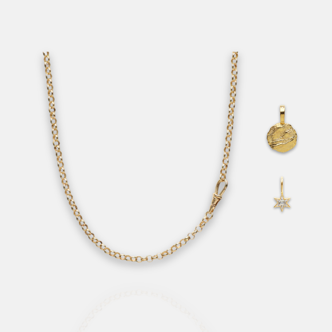 Our Albert Chain Necklace with Coin & Star Charms blends celestial sparkle with organic form - a textured molten coin paired with a amethyst set star charm, suspended from our timeless vintage chain.