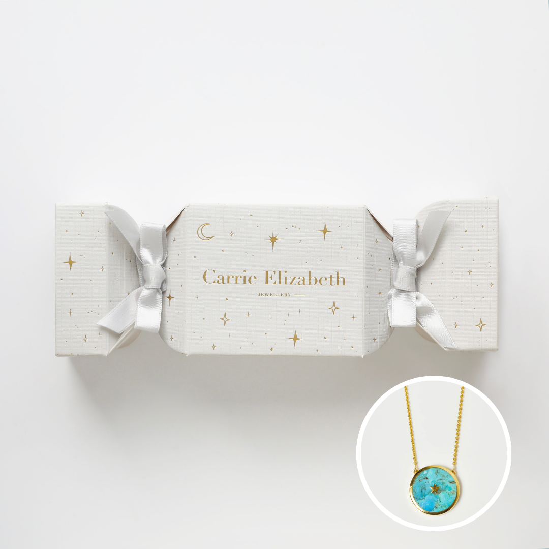Nestled inside this exclusive Carrie Elizabeth cracker is one of our bestselling gemstone necklaces.