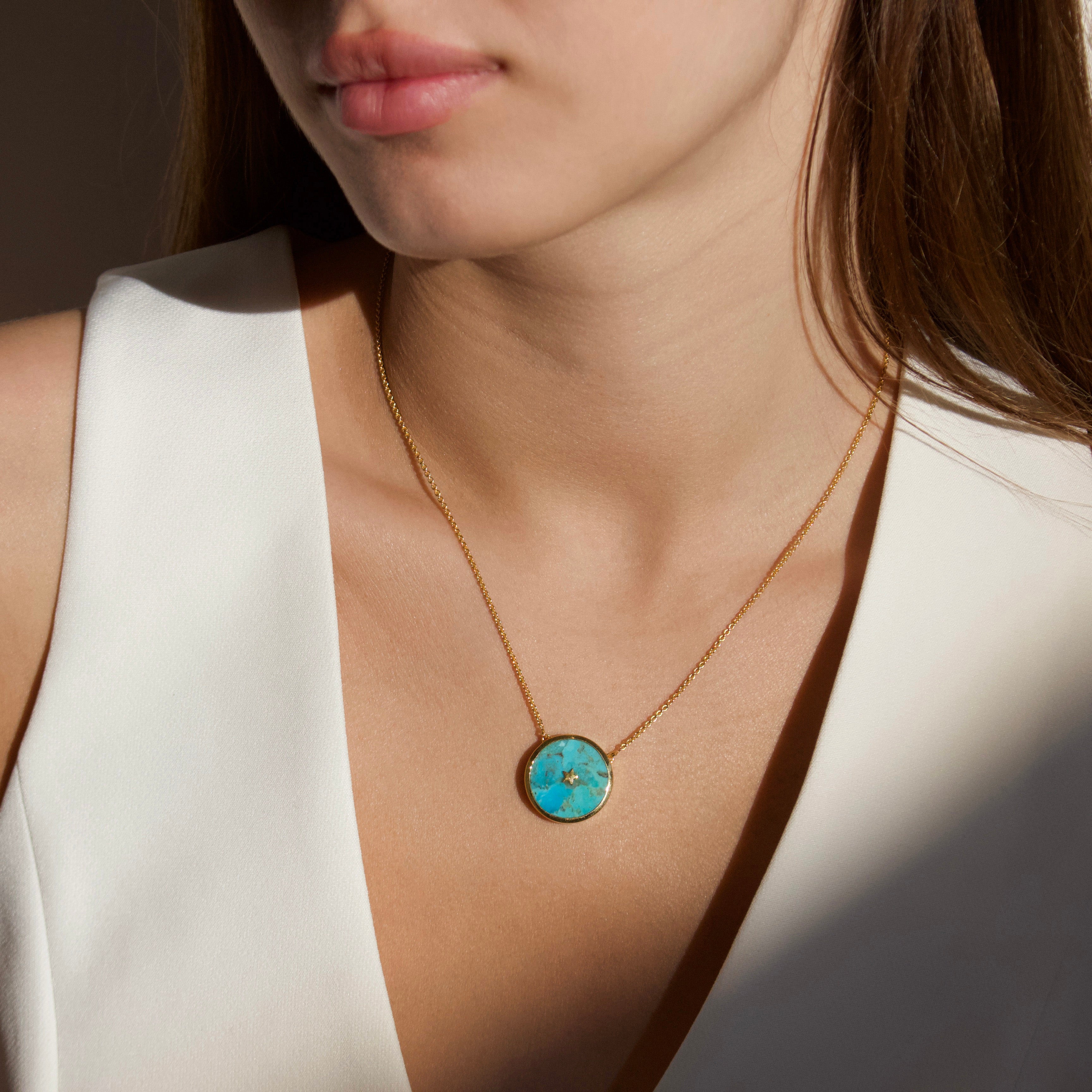 The Night Sky Turquoise Necklace holds a stunning turquoise stone with a tiny 14k Gold Vermeil star twinkling brightly in its centre. With a unique mix of blue, green and metallic hues, hypnotic turquoise brings to mind the cosmic brilliance of the night sky!