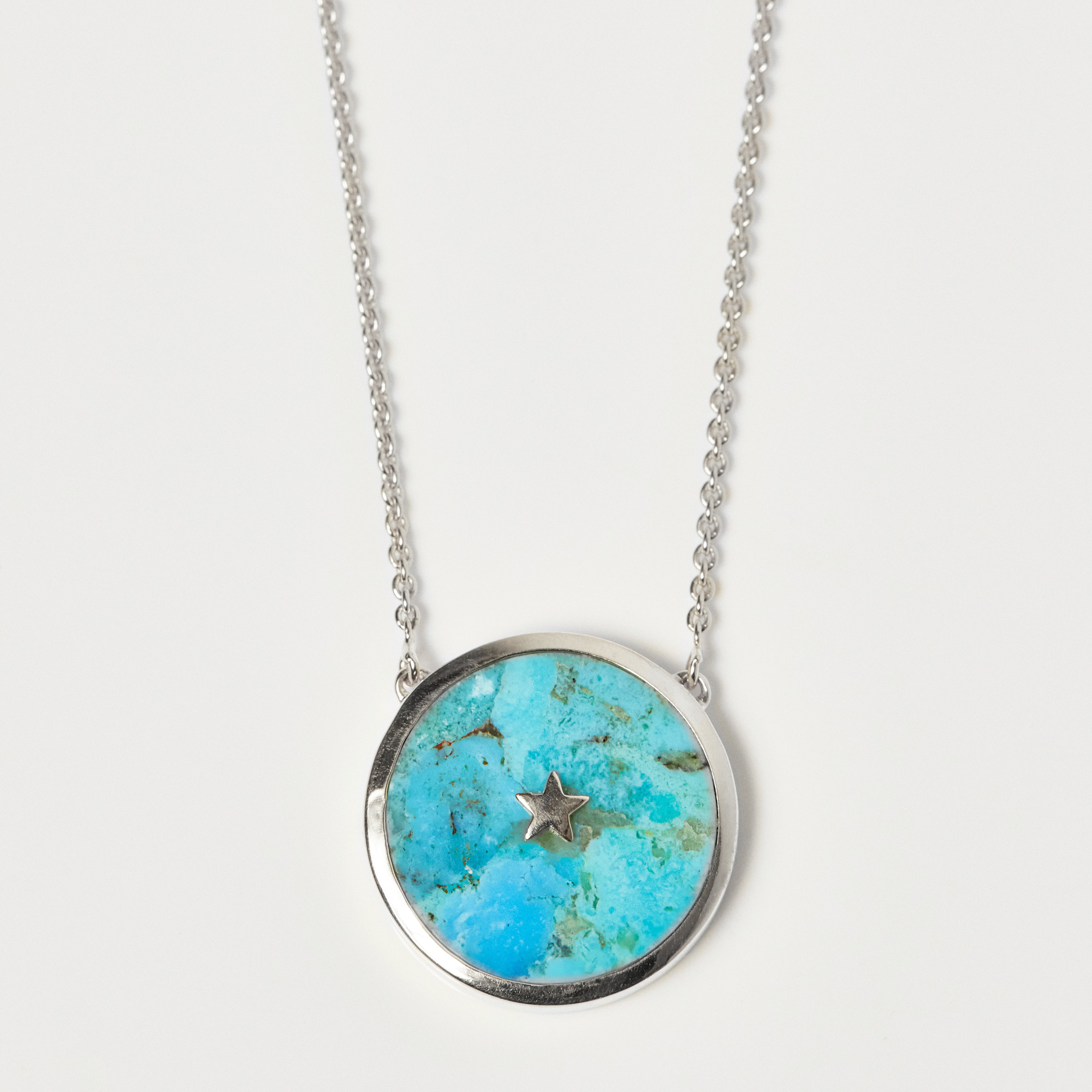 The Night Sky Turquoise Necklace holds a stunning turquoise stone with a tiny 1sterling silver star twinkling brightly in its centre. With a unique mix of blue, green and metallic hues, hypnotic turquoise brings to mind the cosmic brilliance of the night sky!