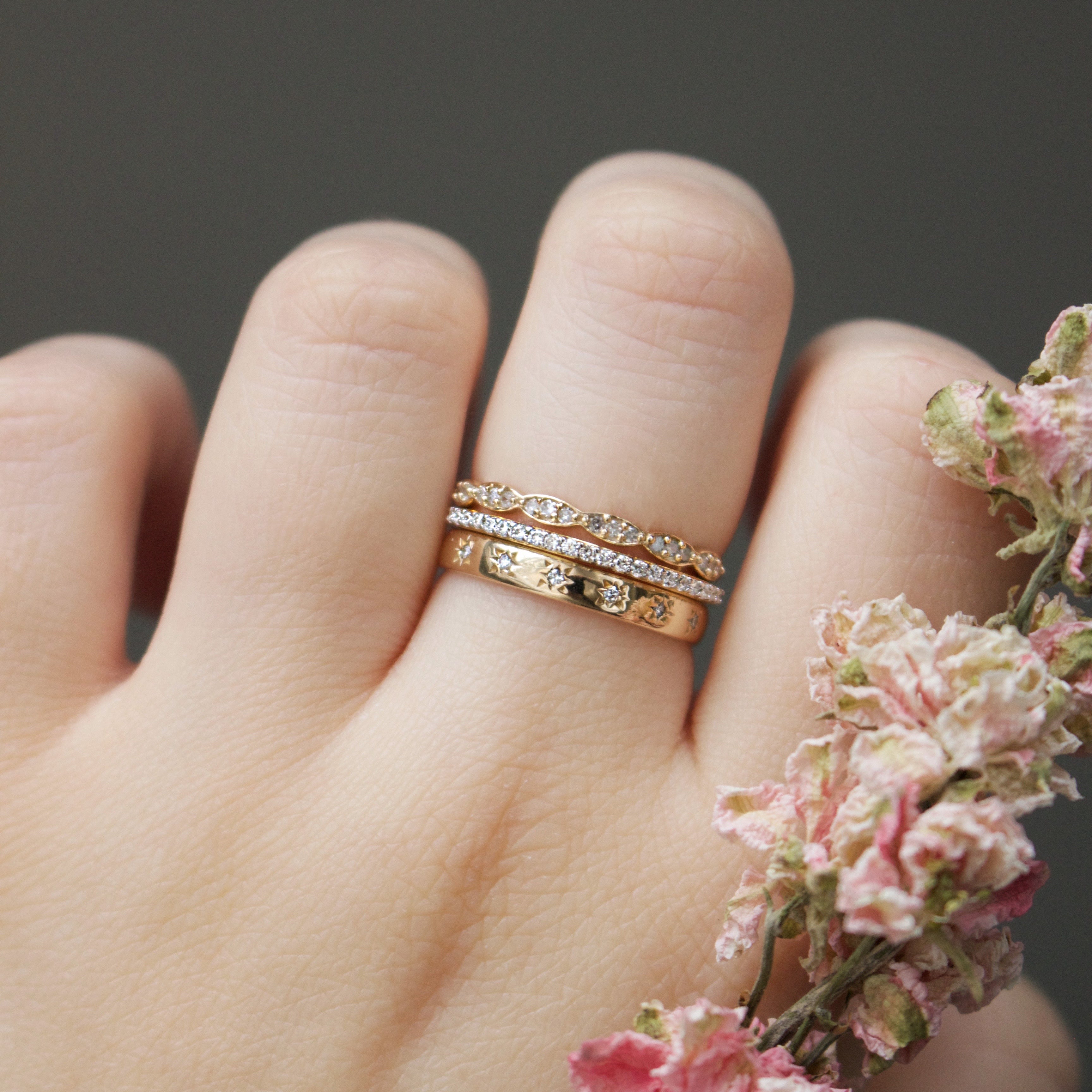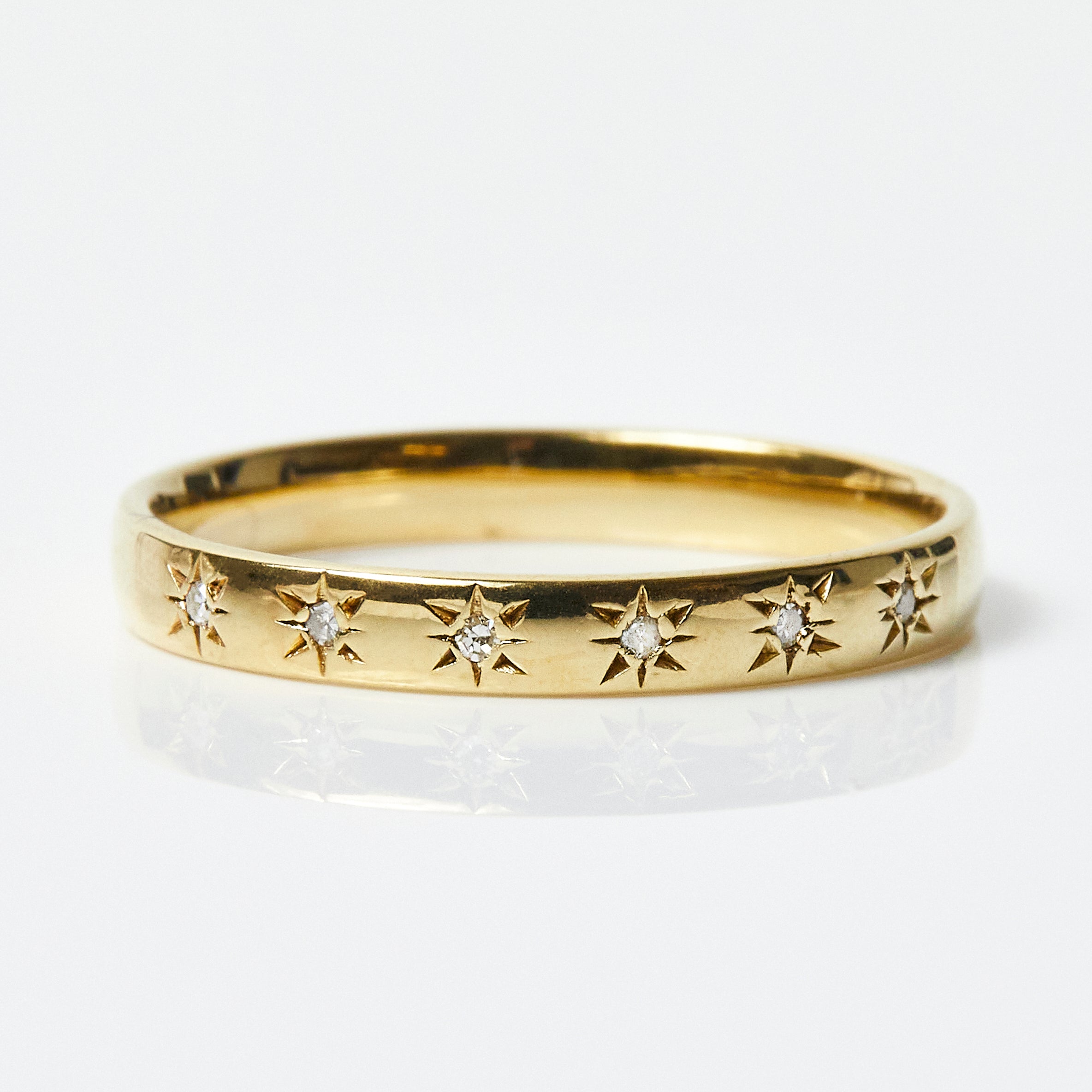 Simple, stackable and beautiful, the solid 9k yellow gold Simple Star Set Diamond Band adds a little bit of cosmic energy to your ring set! Sparkling diamonds are set into a gold band with a vintage-inspired star setting. It's the ideal everyday ring, and also stacks beautifully with your other Carrie Elizabeth favourites!