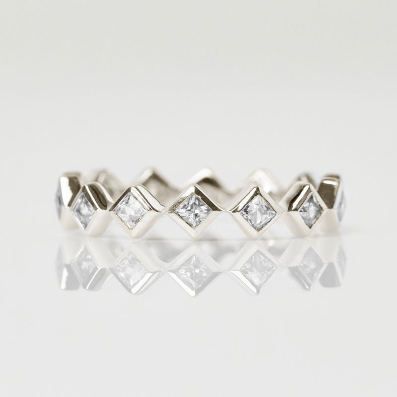 We love our Eternity Rings stacked in a personal curation, a meaningful way to honour the most important people in your life… including yourself! The diamond-shaped bands tessellate perfectly together, creating a nestled band ring in your own individual combination of stones.
