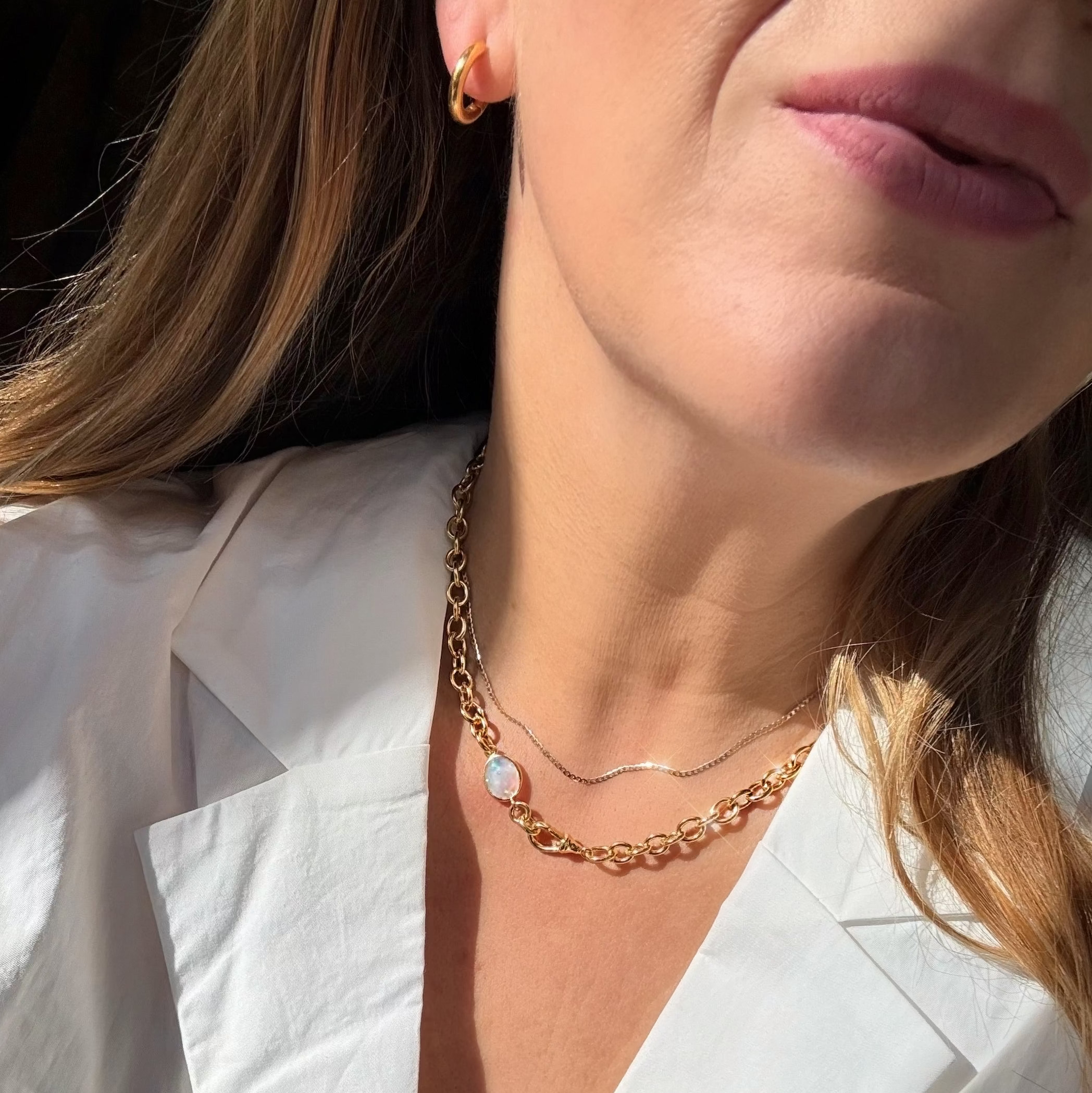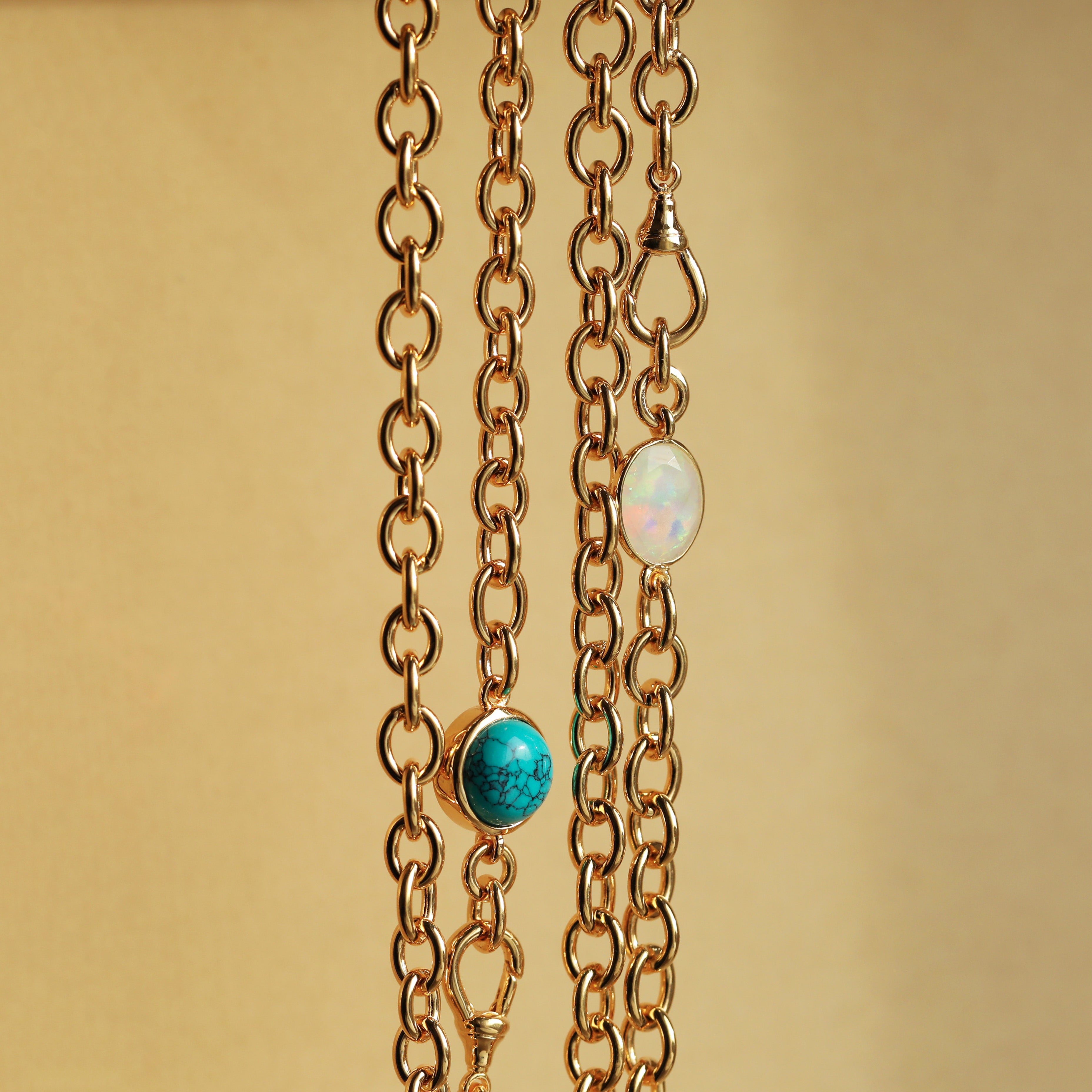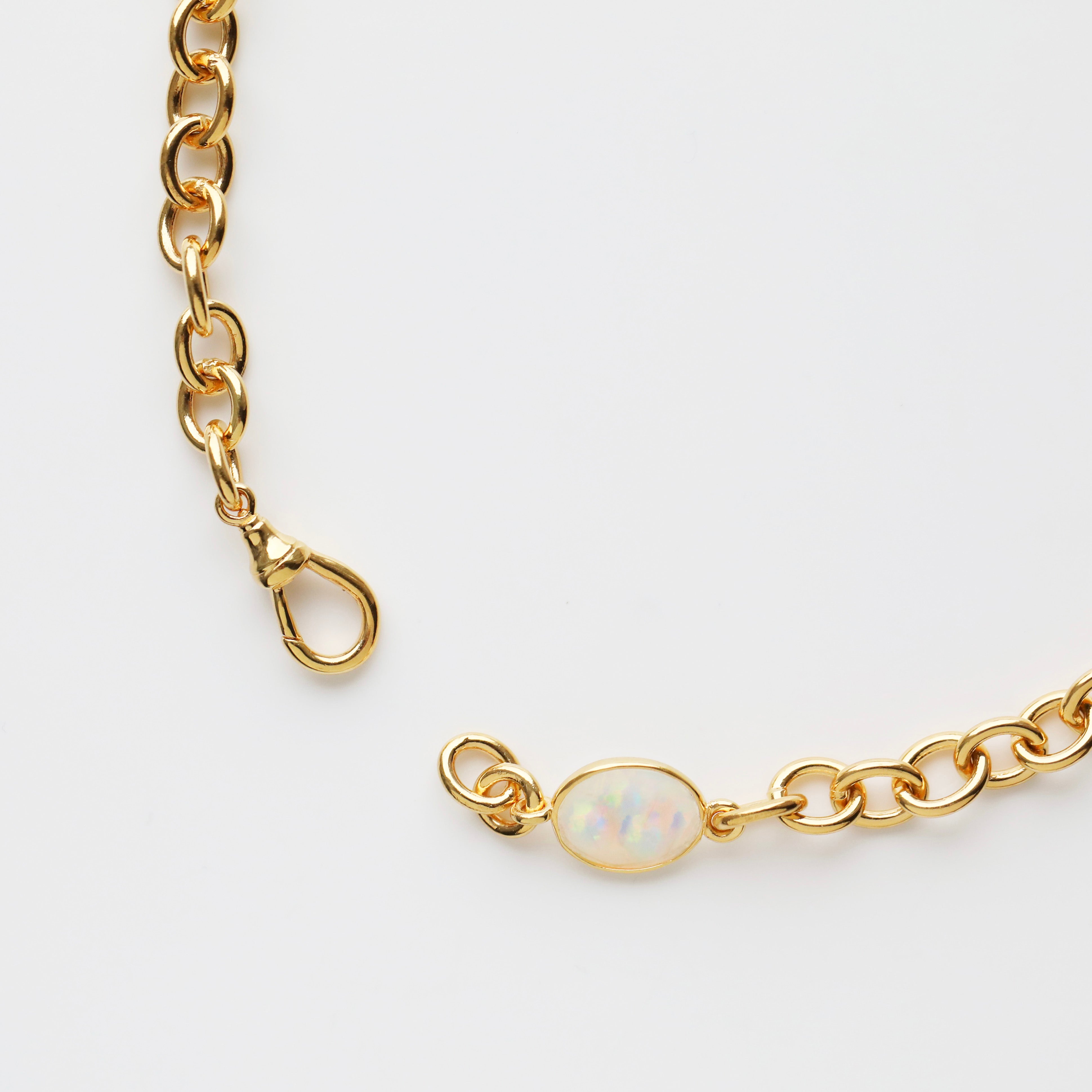 Chunky gold-plated chain creates a bold setting for a beautiful oval opal, with highly polished, tactile links reflecting the light as you move.
