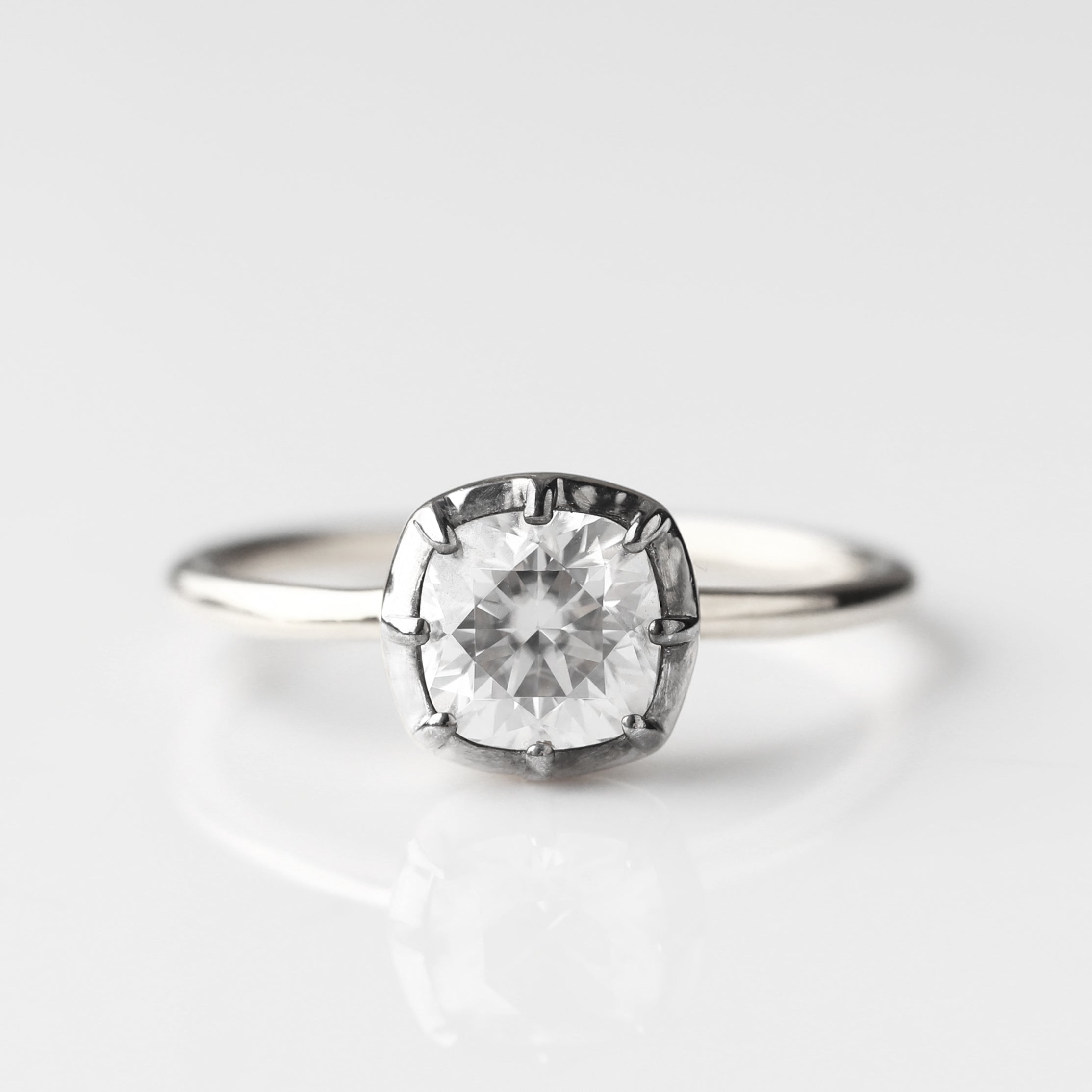 With a sparkling moissanite in a Georgian-style button-back setting, this ring feels like the dream auction-house or antique market find! Endlessly versatile, it has the timeless appeal of a diamond solitaire, but with a unique personality all of its own. Whether paired with vintage treasures or stacked with contemporary rings, it's a true wear-forever design.