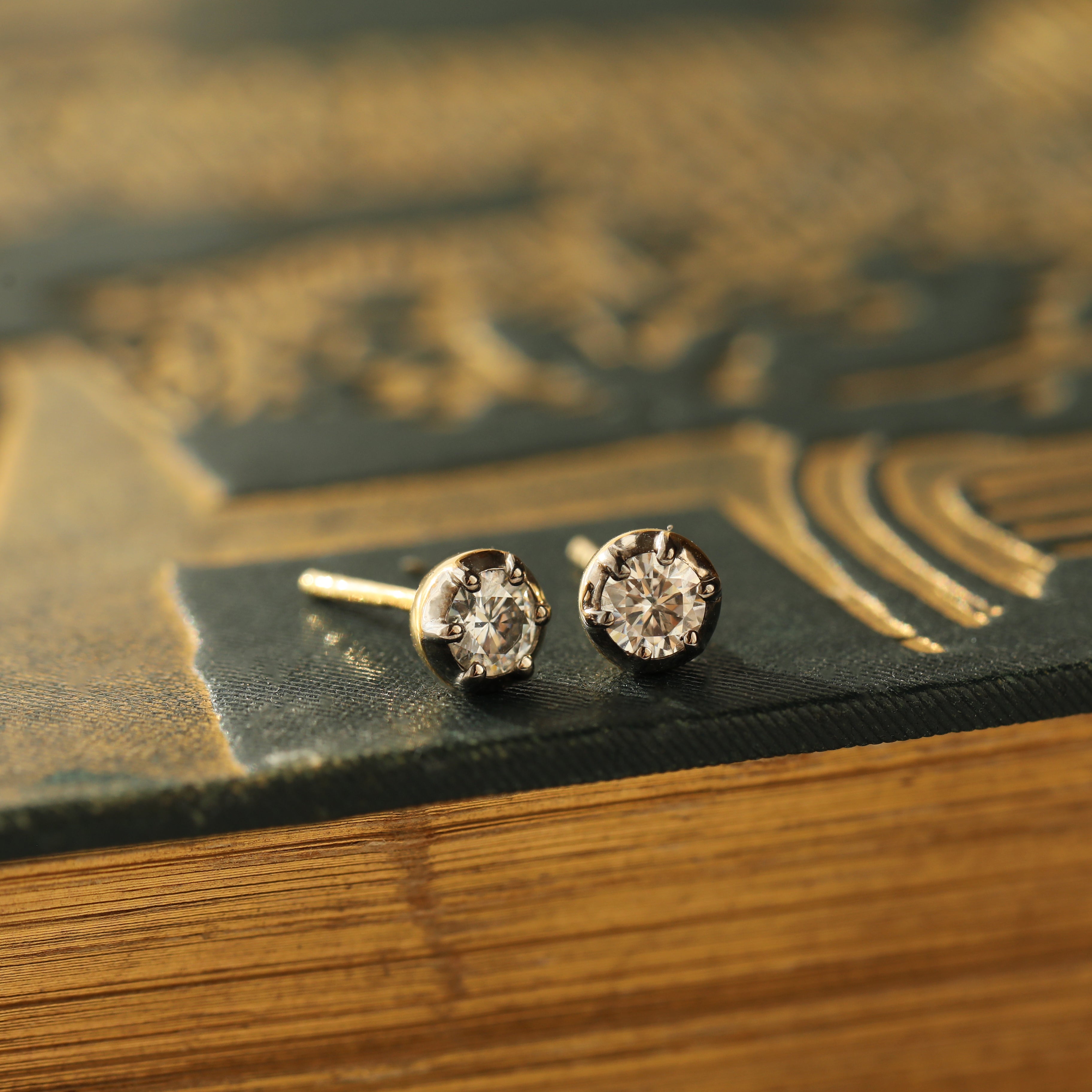 With a sparkling moissanite in a Georgian-style button-back setting, these stud earrings feel like the dream auction-house or antique market find! Endlessly versatile, they have the timeless appeal of a diamond solitaire studs, but with a unique personality all of their own.