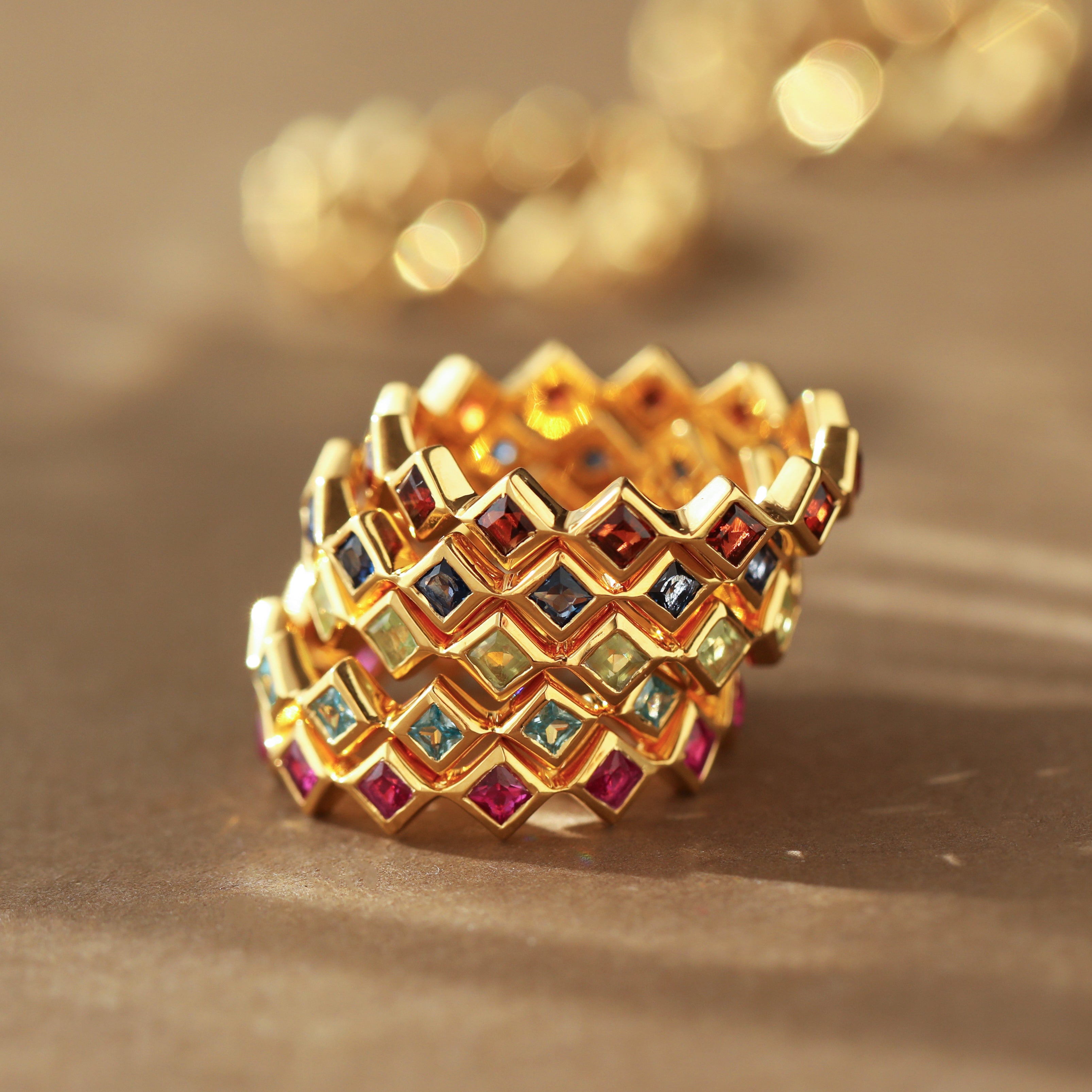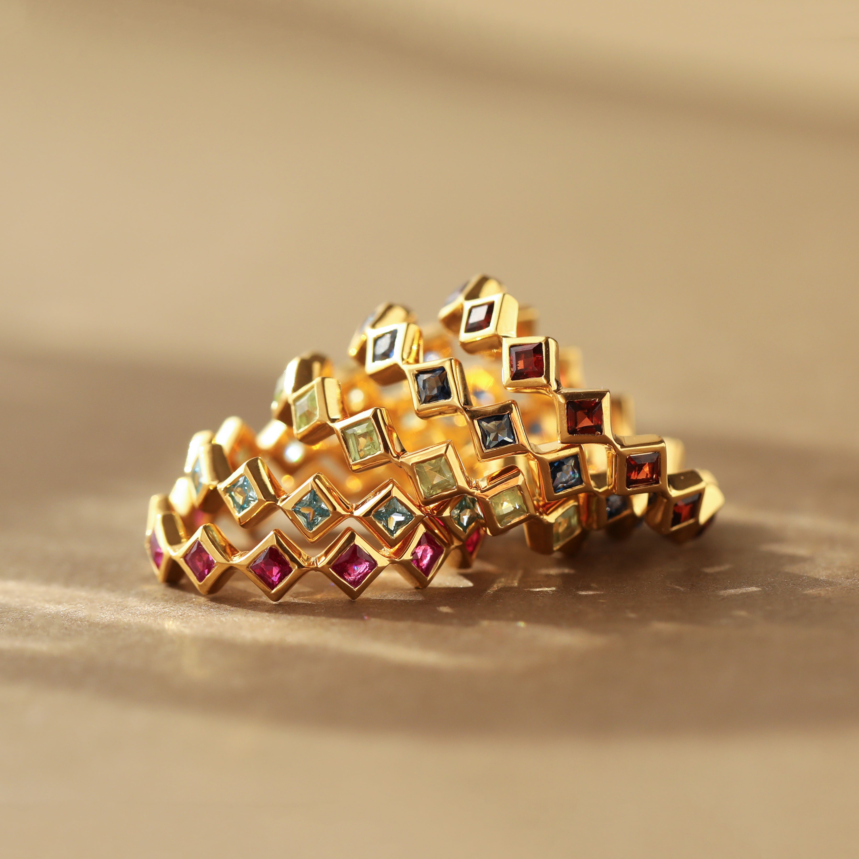 We love our Eternity Rings stacked in a personal curation, a meaningful way to honour the most important people in your life… including yourself! The diamond-shaped bands tessellate perfectly together, creating a nestled band ring in your own individual combination of stones.