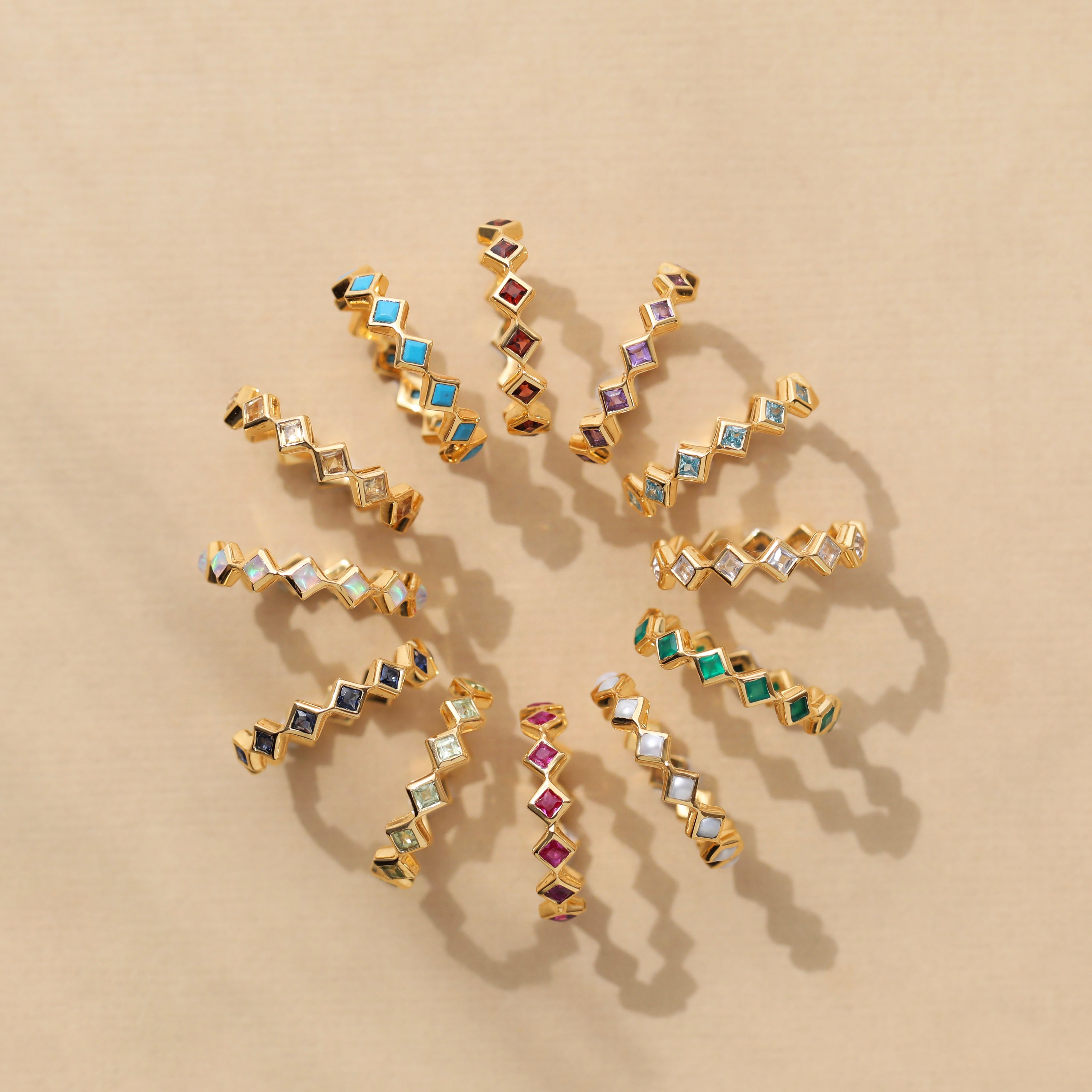 Featuring compass-set square gemstones, the striking Eternity Ring is a modern, bohemian take on a timeless style. Available in all twelve birthstones, bezel-set in gold vermeil, it blends personal symbolism with vibrant self-expression.