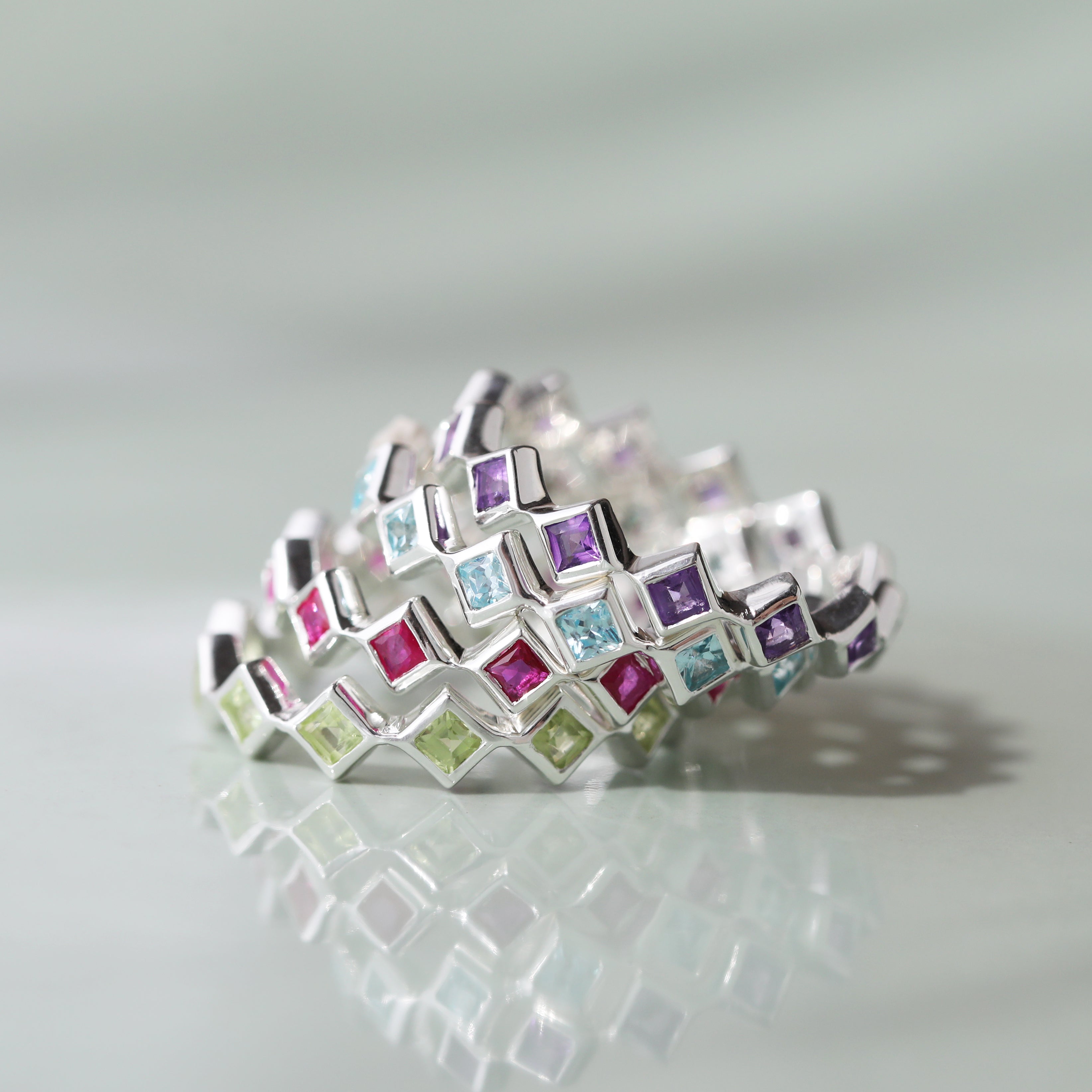 Featuring compass-set square gemstones, the striking Eternity Ring is a modern, bohemian take on a timeless style. Available in all twelve birthstones, bezel-set in sterling silver, it blends personal symbolism with vibrant self-expression.