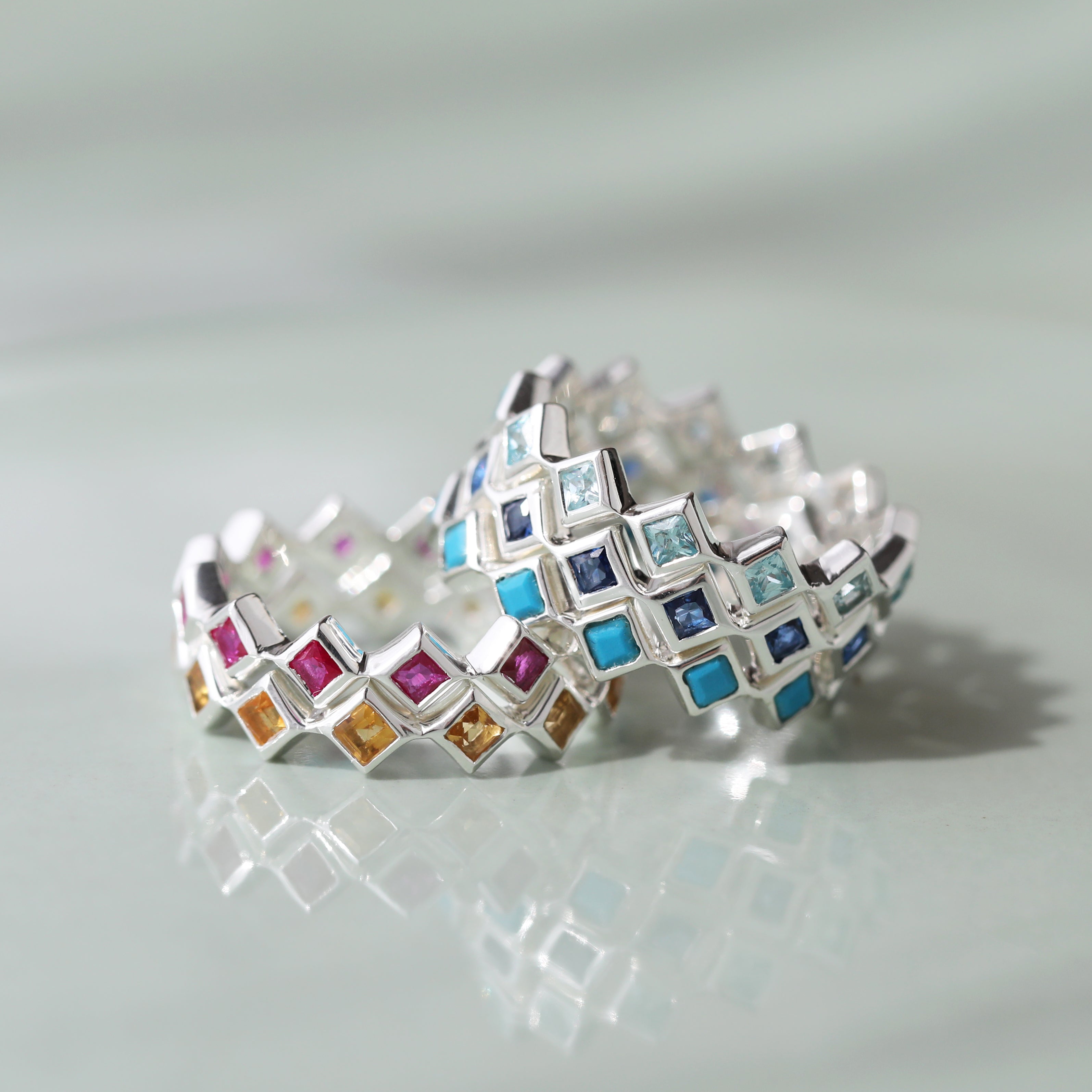 We love our Eternity Rings stacked in a personal curation, a meaningful way to honour the most important people in your life… including yourself! The diamond-shaped bands tessellate perfectly together, creating a nestled band ring in your own individual combination of stones.