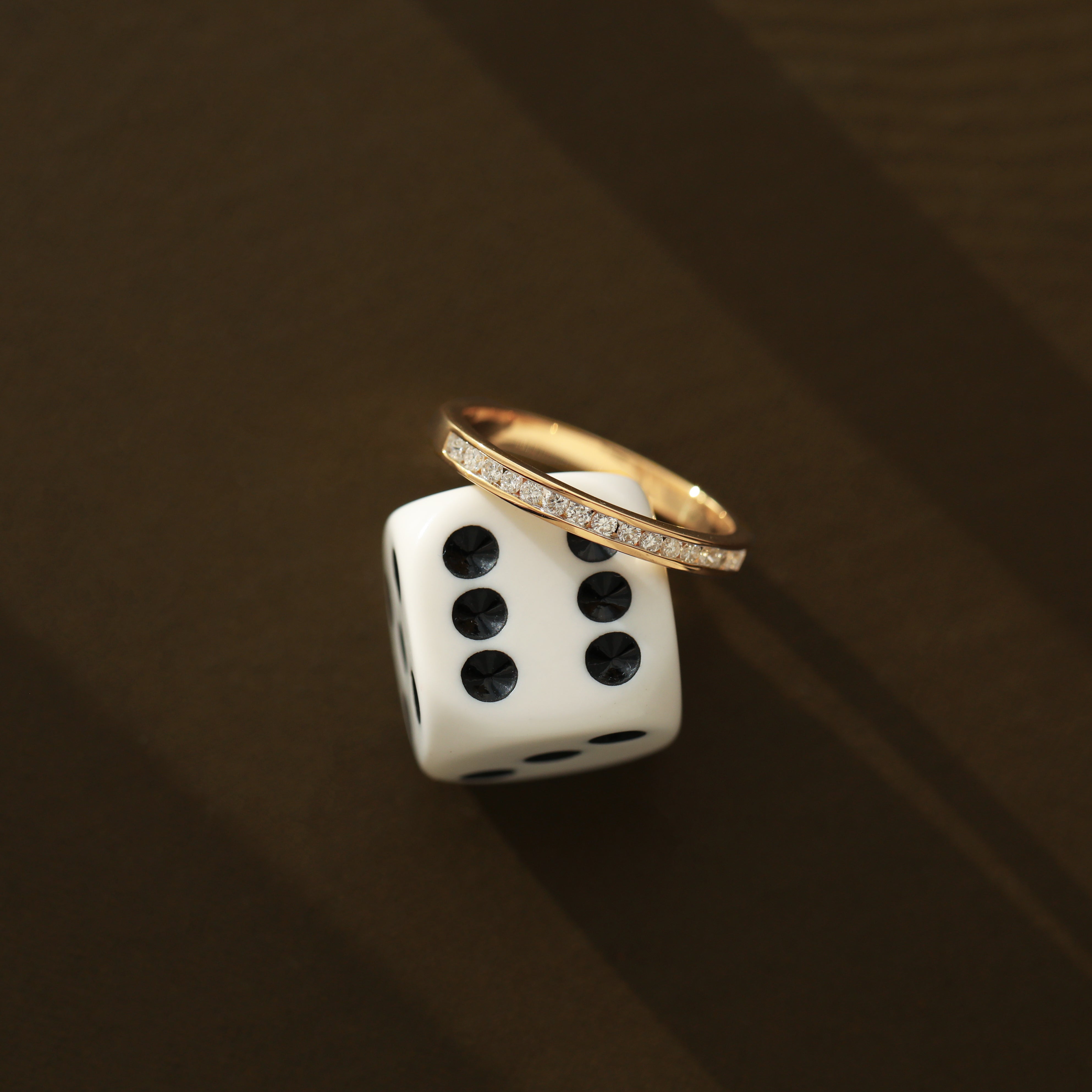 A row of sparkling diamonds runs along the top of the band, channel-set for a clean, streamlined finish. This contemporary setting style looks efforlessly cool and makes the ring beautifully practical to wear.