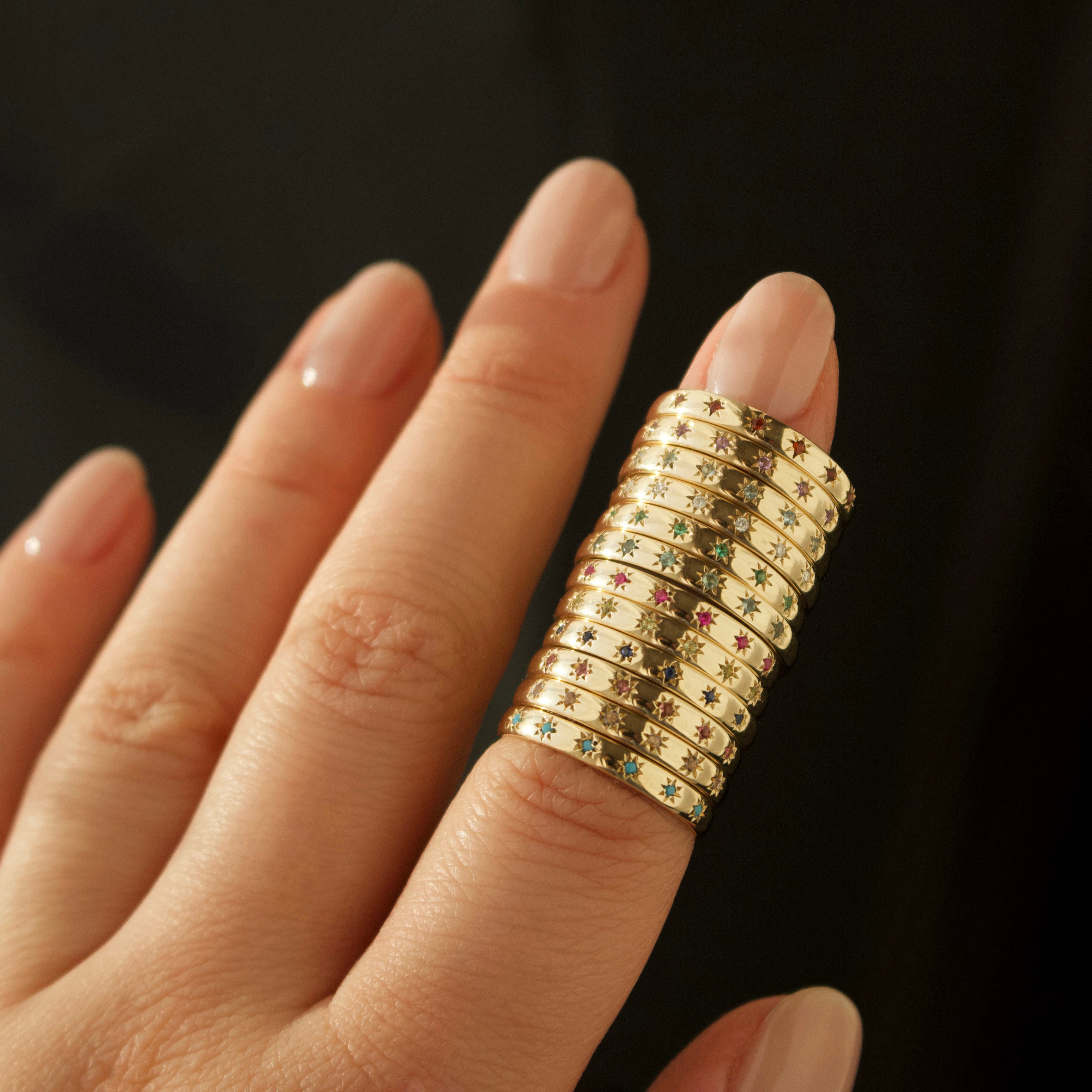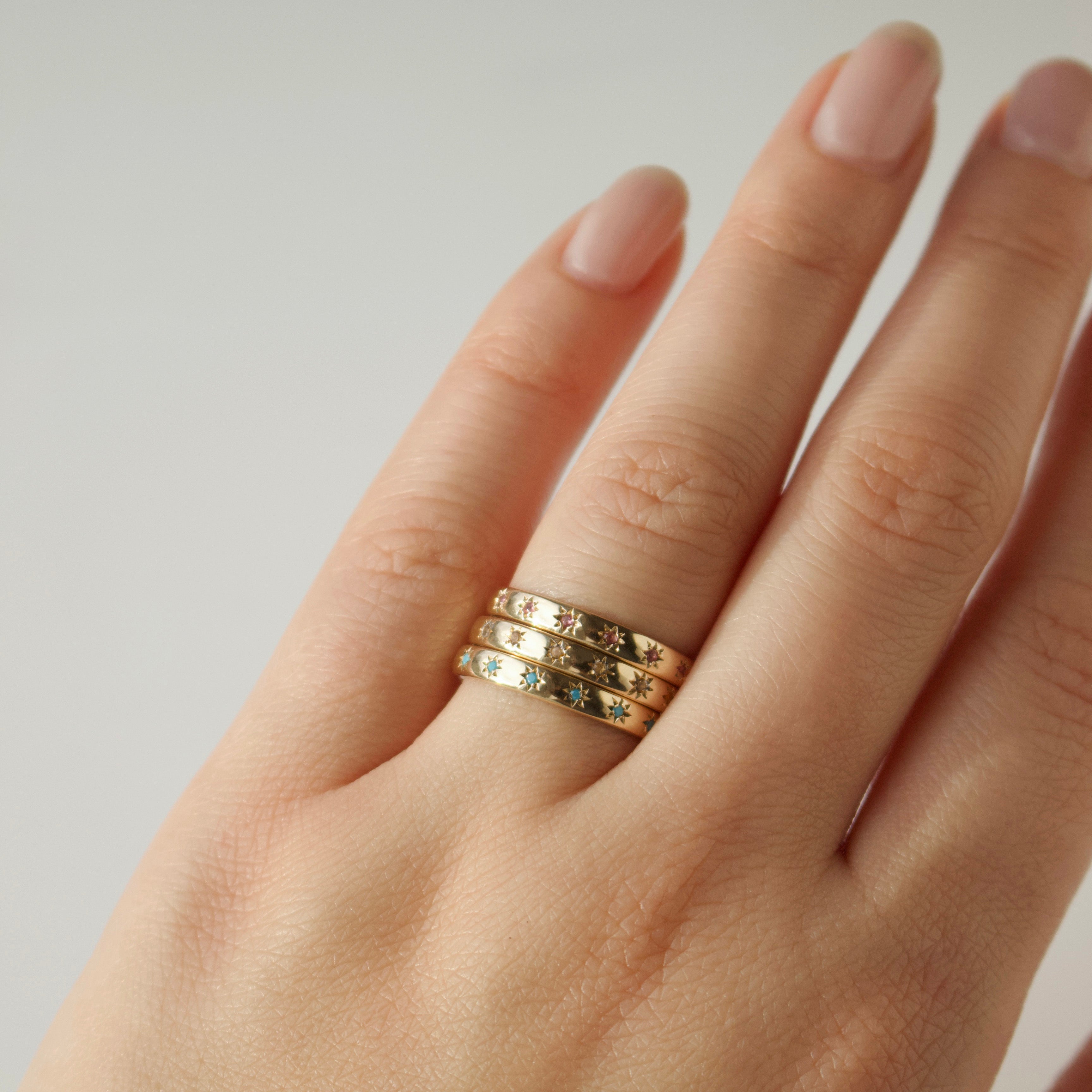 A row of star-set gemstones twinkles from a polished 1.8 mm band, a modern take on a vintage setting style. The ring is available in a choice of twelve symbolic birthstones, one of every month of the year. Personal and wearable, it’s a sweet and subtle way to make your jewellery meaningful to you, whether you celebrate your own birth month or that of your loved ones.