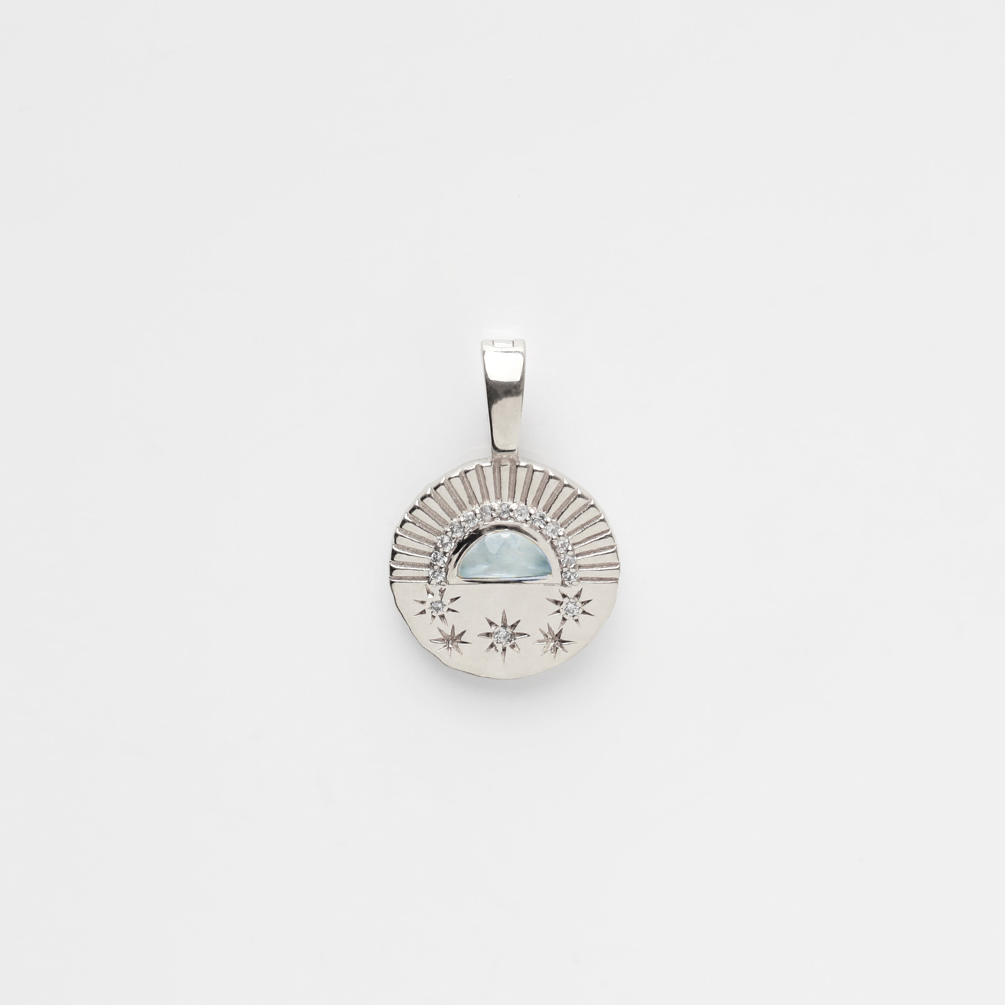 The sterling silver Chapters I Rise Coin Pendant is a powerful symbol of resilience and renewal. With aquamarine for happiness and cubic zirconia for celebration, this coin pendant represents the triumph of coming through challenges and finding joy again. You can discover more about the meanings and properties of all our gemstones here.