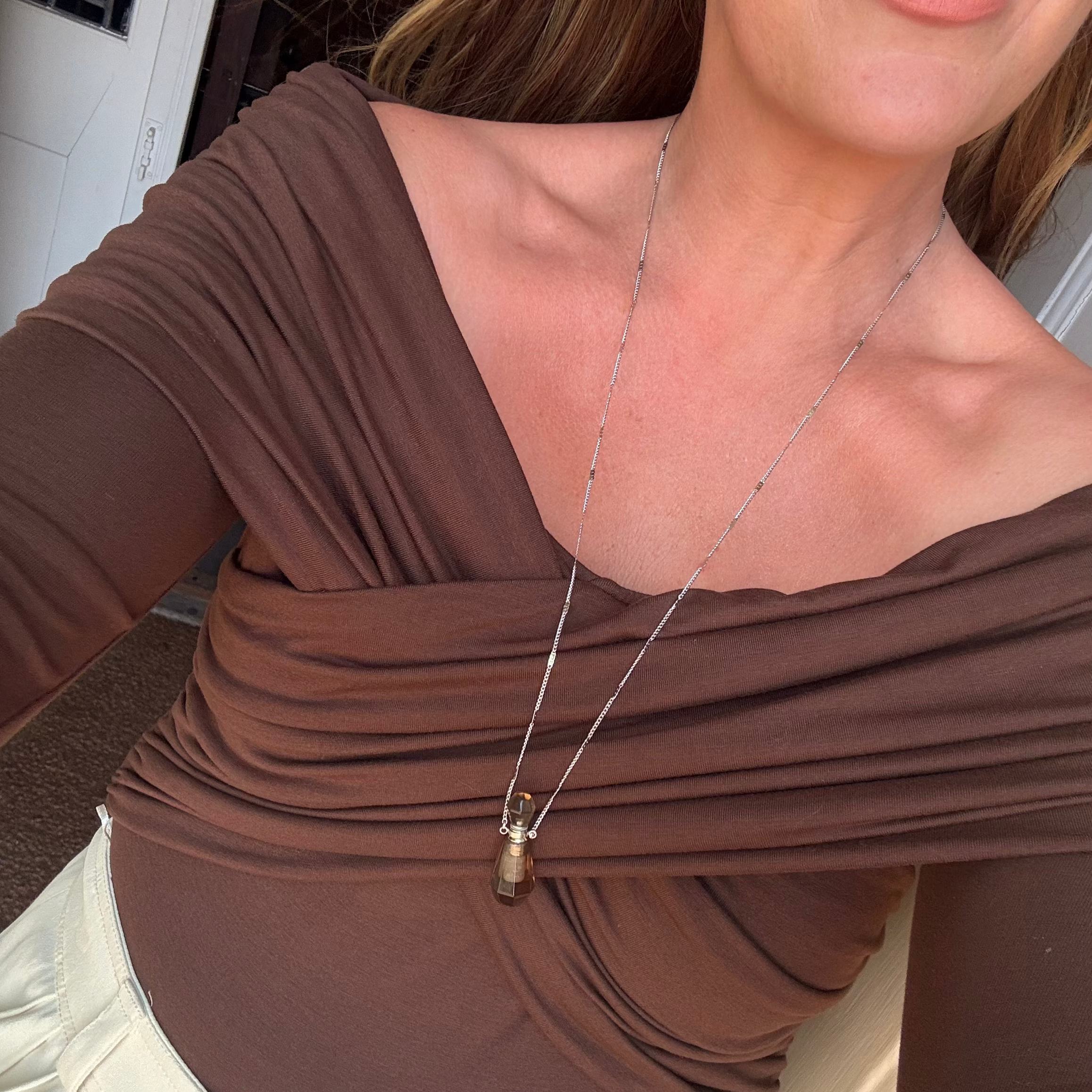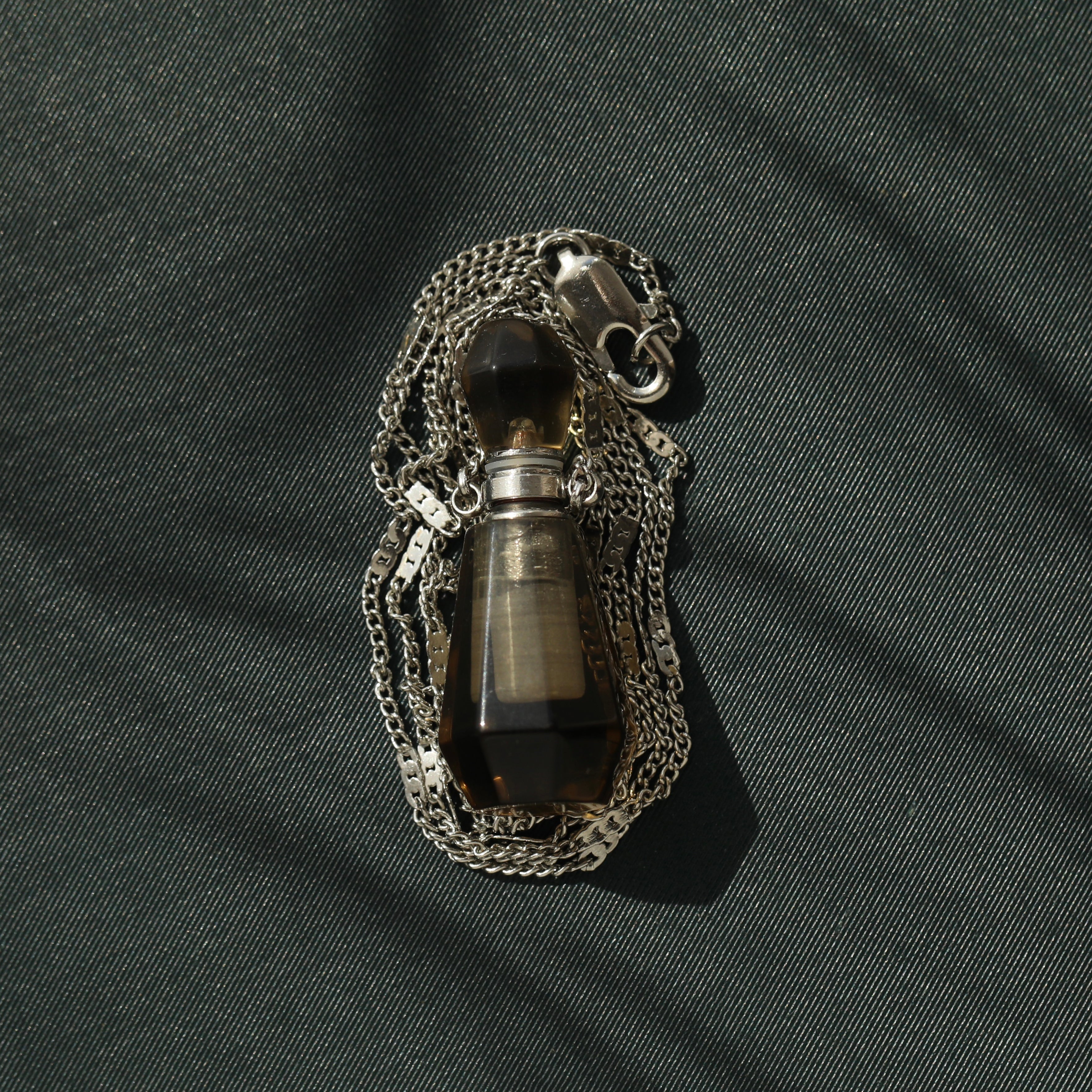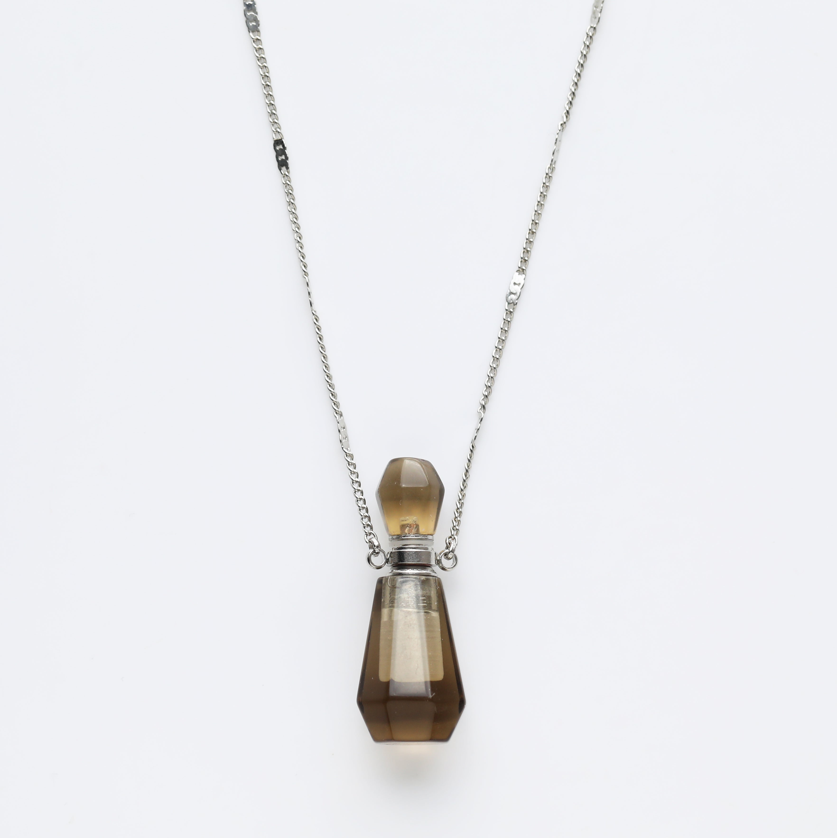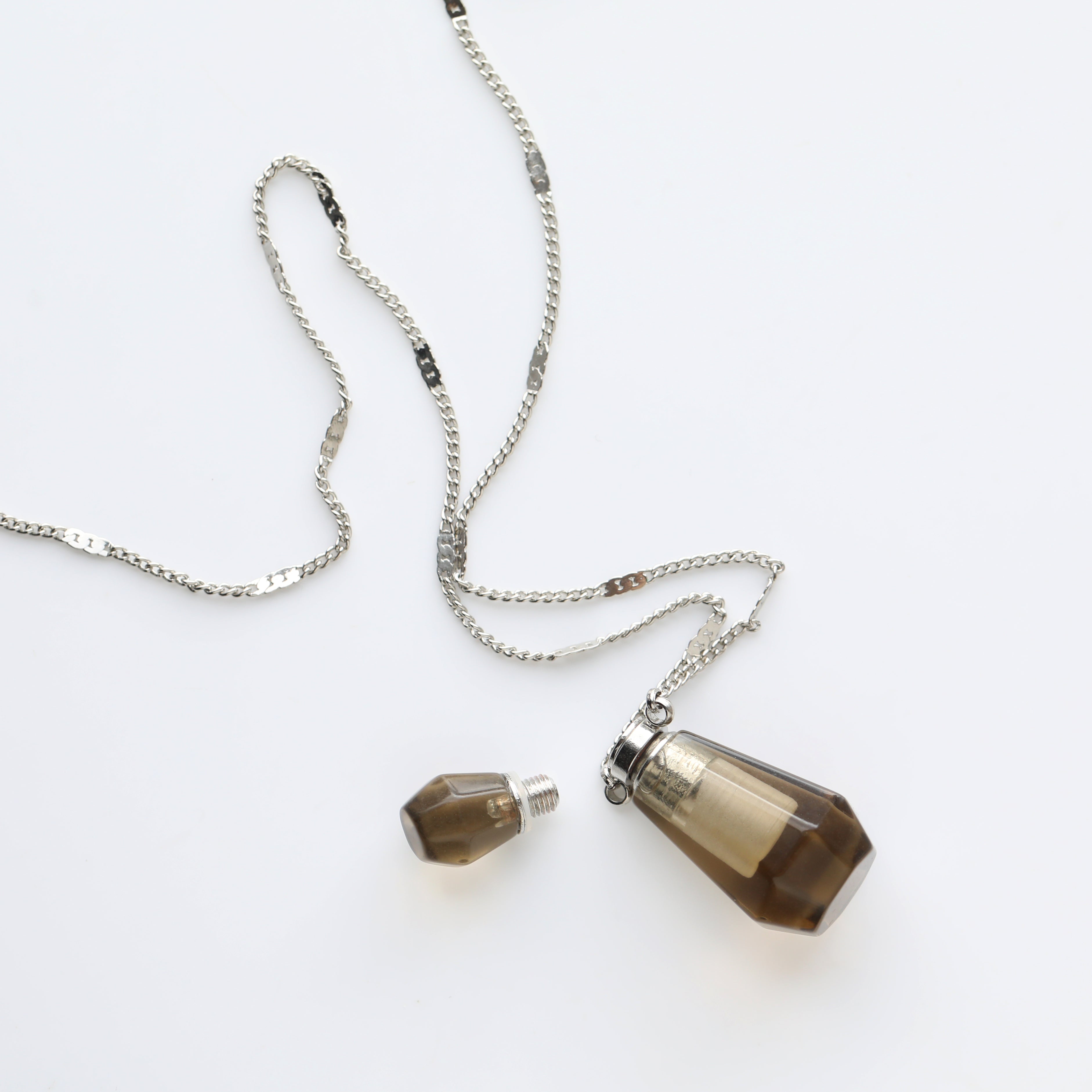 Inspired by vintage curiosities, this antique perfume-style bottle design is carved from smoky quartz and set on a long, silver-plated chain. Opening with a screw top, you can carry a tiny rolled up love note inside - a secret and personal finishing touch!