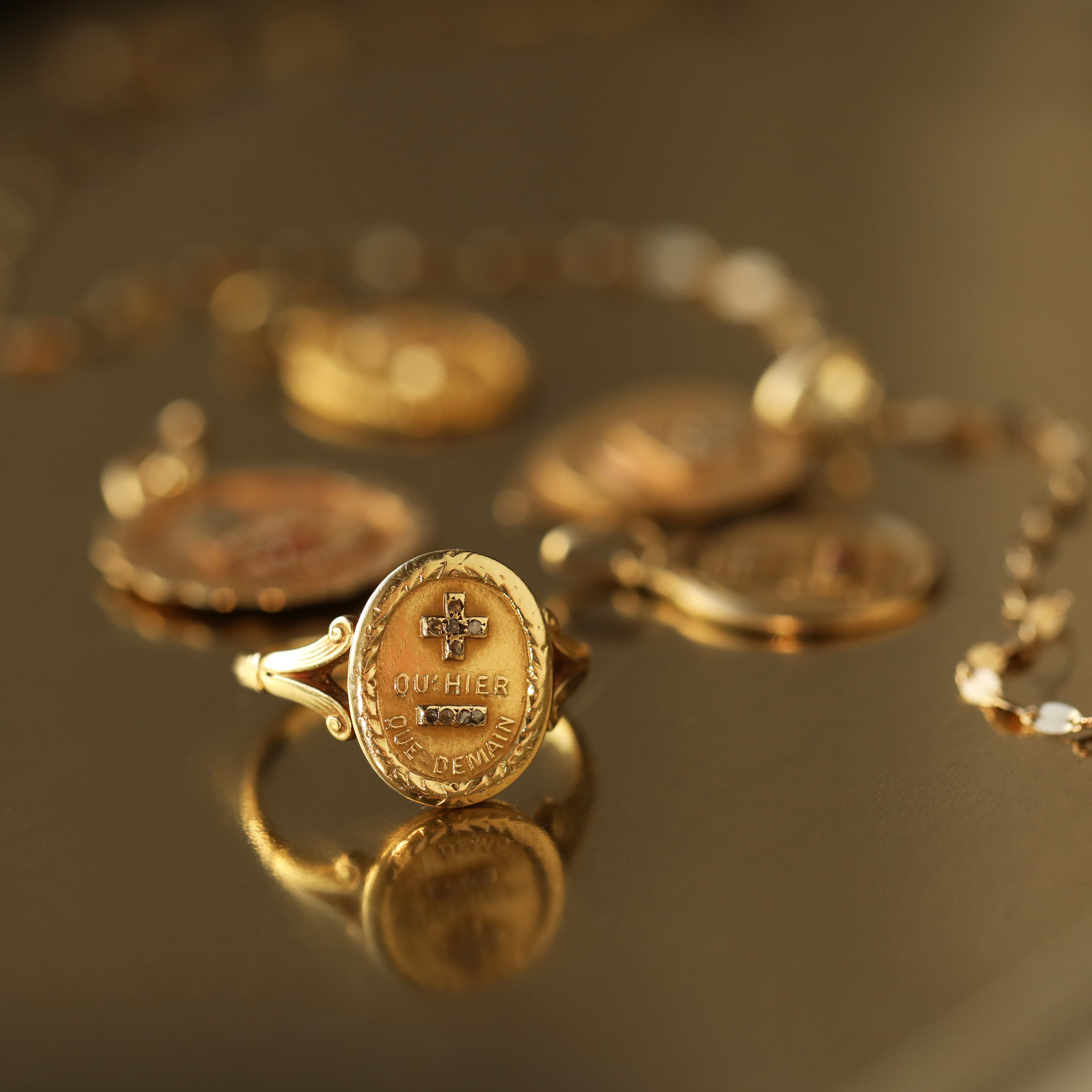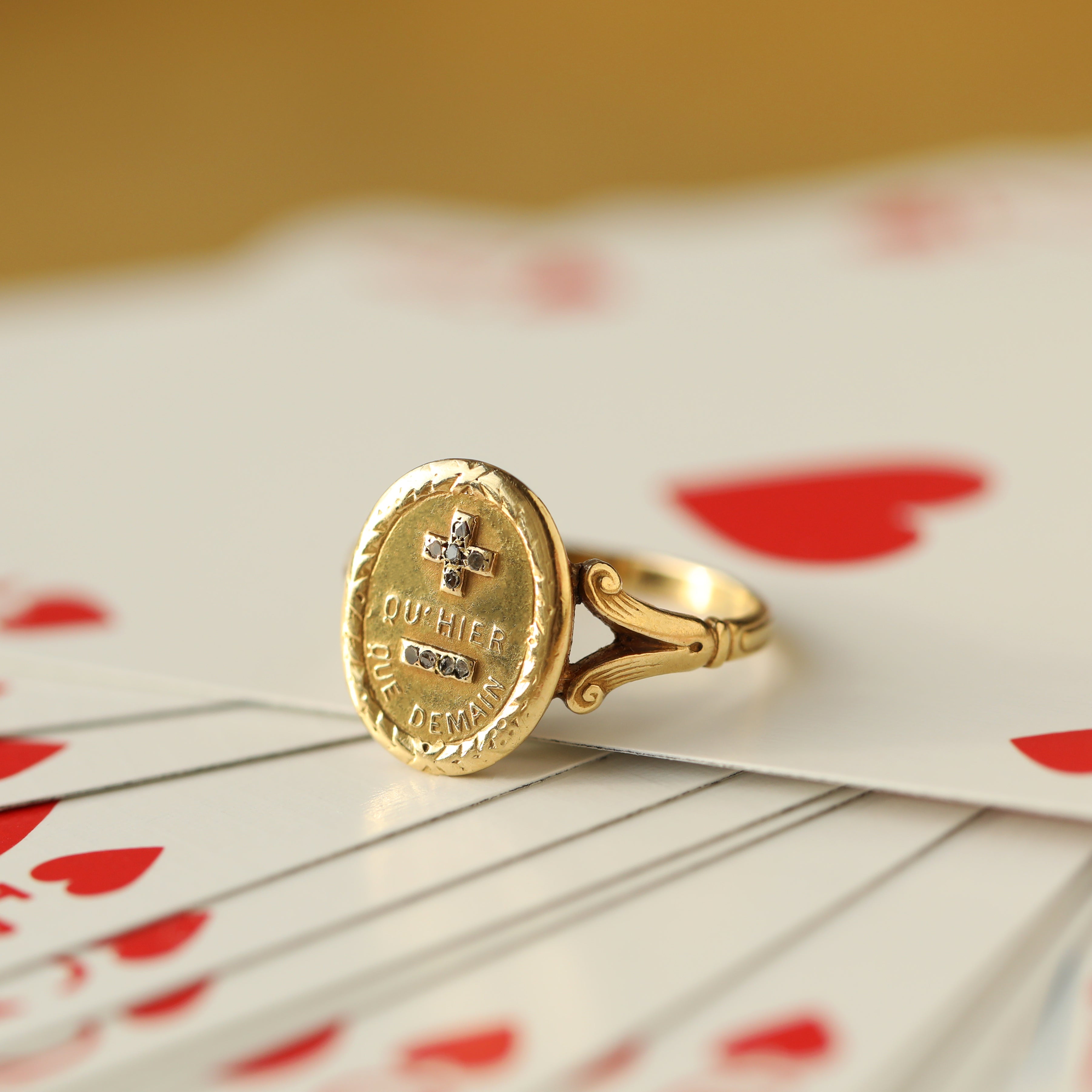 This beautiful signet ring holds the powerful quote 'Qu'hier Que Demain', inspired by a beautiful French poem by Rosemonde Gérard and means "I love you more than yesterday and less than tomorrow". A romantic and meaningful proclamation of love, this ring is the perfect piece to add to your stack today, and to keep forever.