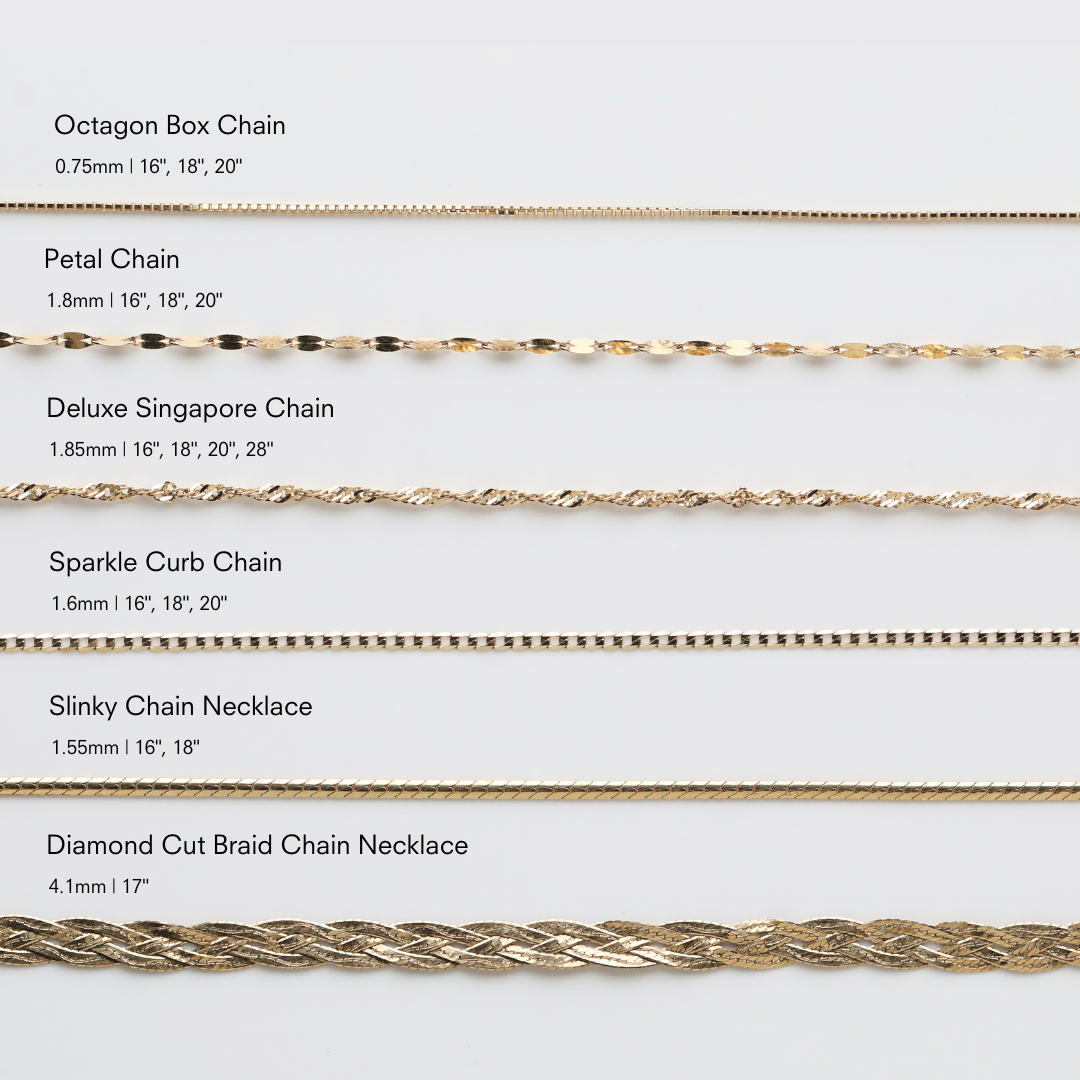 Our best selling Singapore necklace is now made even better, the new deluxe thicker design makes this chain the best choice for stacking multiple treasured charms! Select your charms and then choose your favourite solid gold chain to wear them on. Our super sparkly 9k Singapore chain and Octagon box chain also make the perfect canvas to tell your story (please check their maximum charm capacity)