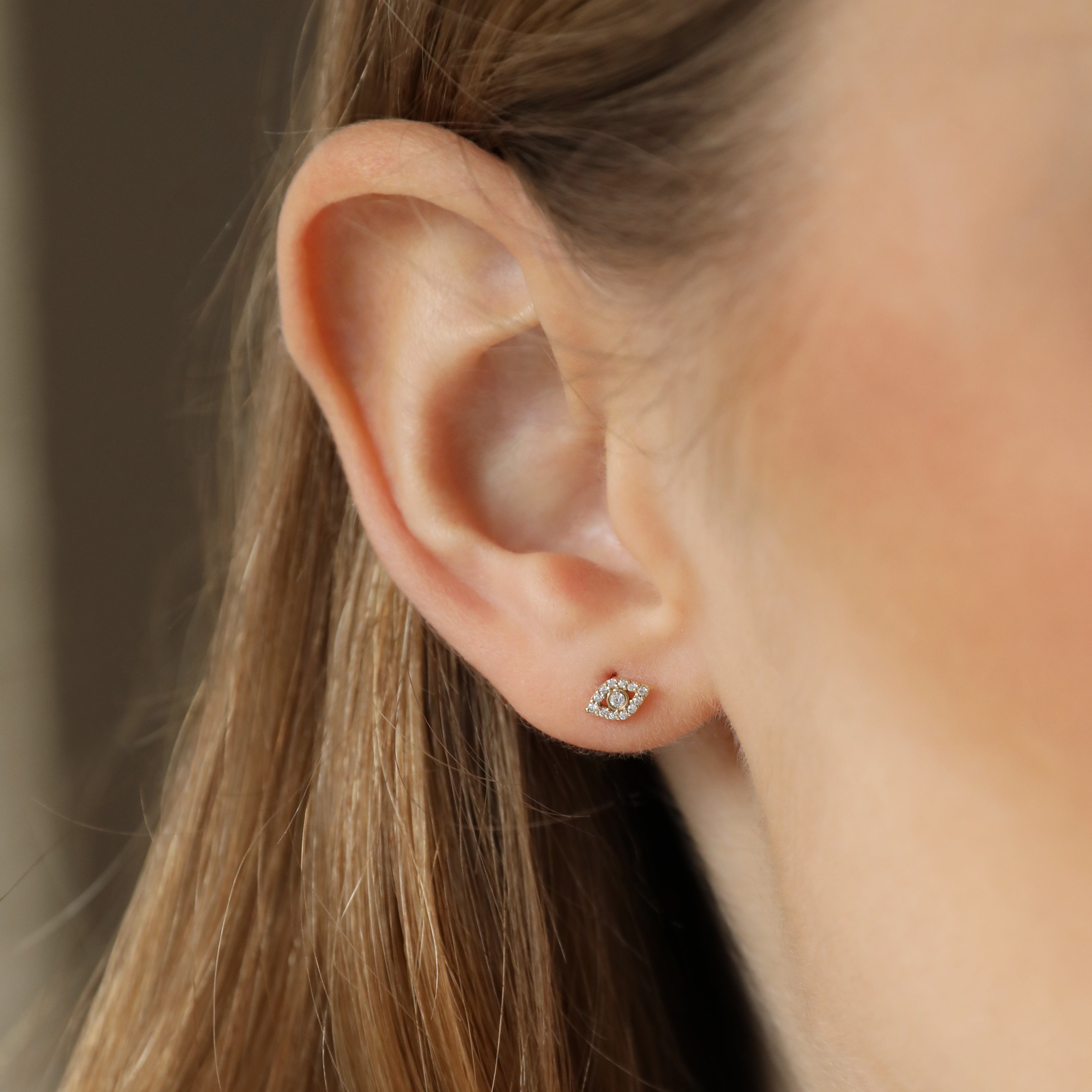 A modern talisman of protection, the Evil Eye Stud Earrings glitters with pavé-set cubic zirconia for a luxurious finish. Delicate yet striking, it's perfect for mixing with gold and gemstone earrings for a look that’s all your own. And in 9k solid gold, you can wear this baby day in, day out, forever!