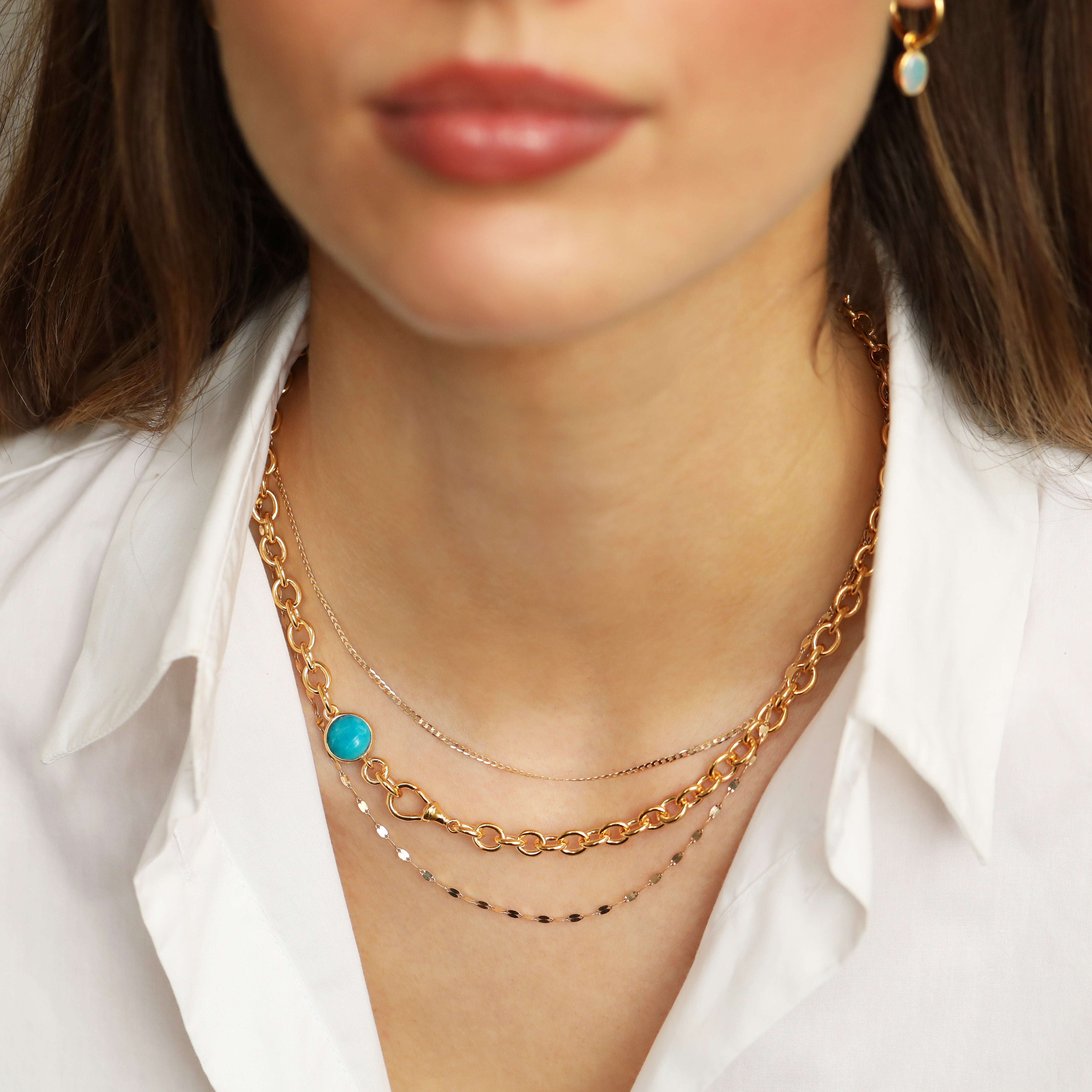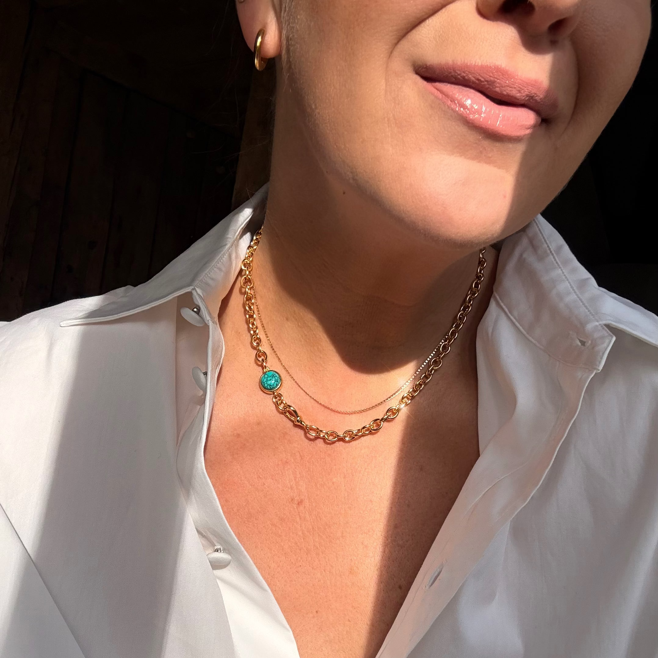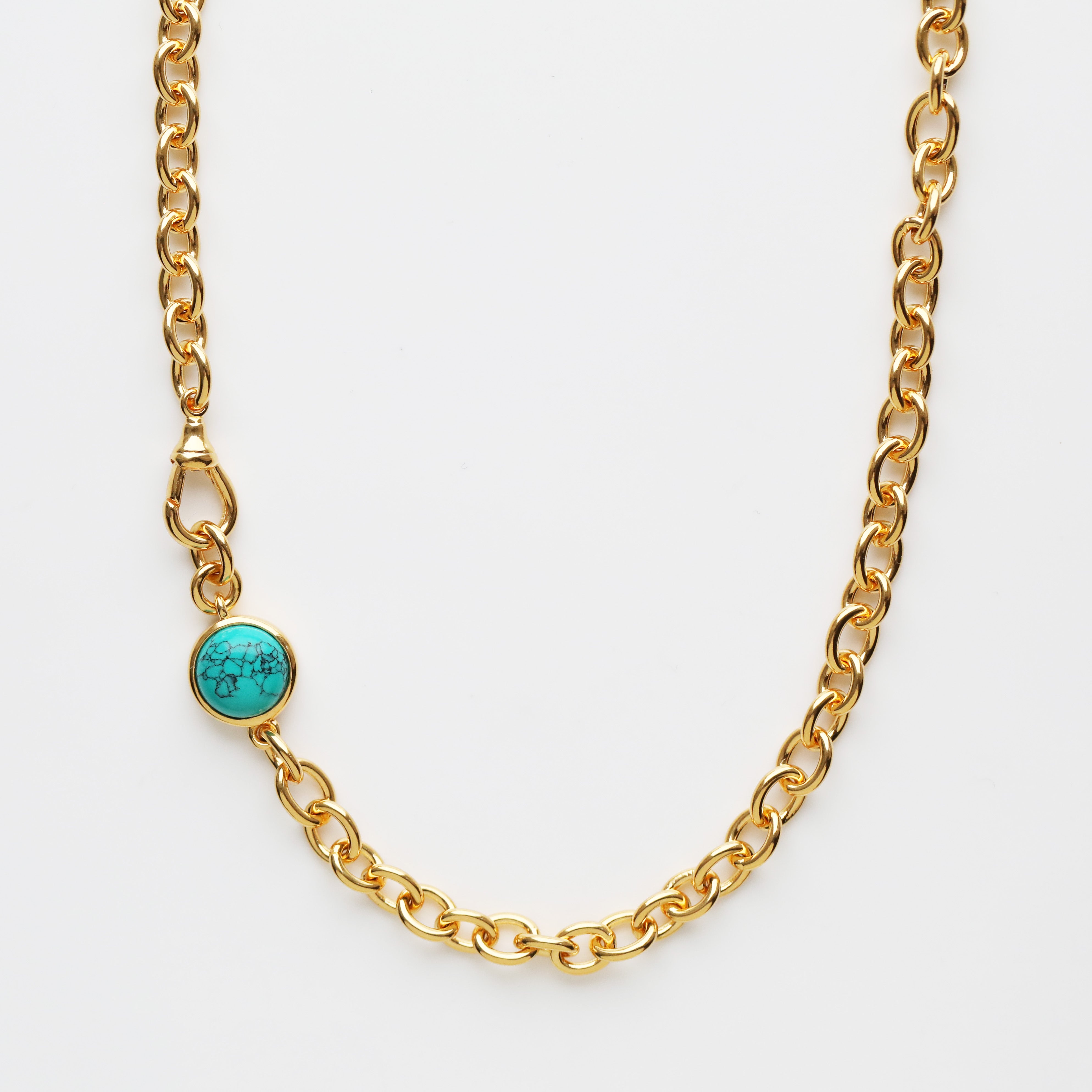 Chunky gold-plated chain creates a bold setting for a beautiful turquoise cabochon, with highly polished, tactile links reflecting the light as you move.